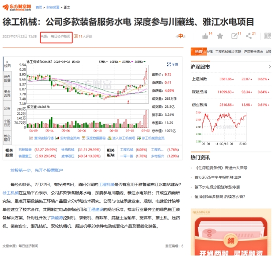 據(jù)每日經(jīng)濟(jì)新聞等多家財(cái)經(jīng)媒體7月22日消息,徐工機(jī)械在互動(dòng)平臺回應(yīng)投資者詢問時(shí)明確表示,公司多款裝備服務(wù)水電,深度參與川藏線、雅江水電項(xiàng)目,并成立西南研究院重點(diǎn)開展極端施工環(huán)境產(chǎn)品需求分析和技術(shù)研究。同日,同花順等多款證券軟件添加徐工機(jī)械“雅下水電概念股”。