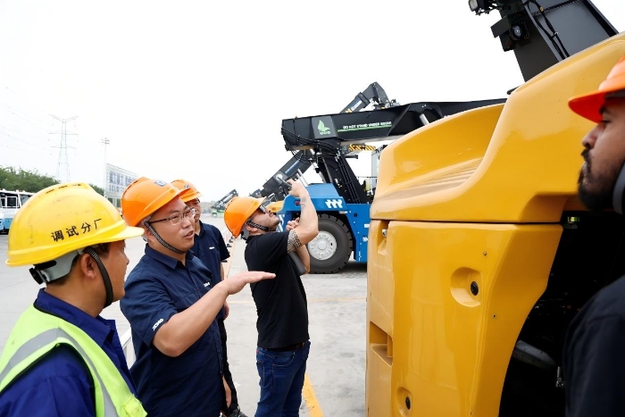 走出駕駛室,團(tuán)隊(duì)聚集在設(shè)備外側(cè),由徐工專家講解整機(jī)結(jié)構(gòu)與維修要點(diǎn),詳細(xì)介紹設(shè)備結(jié)構(gòu)與液壓布置,包括吊臂系統(tǒng)、冷卻模塊、維護(hù)通道與傳感器安裝位置,并針對維修便捷性與安全細(xì)節(jié)展開互動(dòng)。
