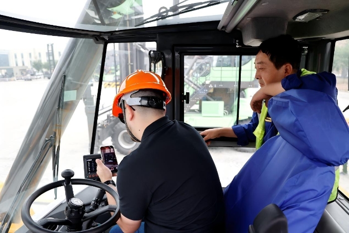 培訓(xùn)內(nèi)容由叉車事業(yè)部服務(wù)培訓(xùn)工程師量身定制,分為理論講解、實(shí)操培訓(xùn)、故障模擬與系統(tǒng)演示四大板塊,確保Tomé技術(shù)團(tuán)隊(duì)真正掌握設(shè)備使用全流程。在正面吊駕駛艙內(nèi),培訓(xùn)工程師Felipe團(tuán)隊(duì)逐步演示整車儀表盤、觸控系統(tǒng)、作業(yè)模式切換、診斷菜單使用方式,學(xué)習(xí)正面吊主控系統(tǒng)標(biāo)定與參數(shù)設(shè)置。
