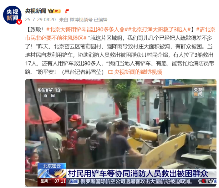 當(dāng)密云區(qū)部分群眾被洶涌洪水圍困、命懸一線之際,鏟車司機(jī)王天宇毅然駕駛徐工鏟車,劈波斬浪駛?cè)胙蜎]區(qū),安全轉(zhuǎn)移80余名被困群眾。這鋼鐵臂膀托舉生命的震撼一幕,贏得了央視《新聞聯(lián)播》的崇高敬意。