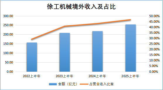 今年上半年,在徐工機(jī)械548.08億元收入中,海外收入255.46億元,同比增長16.64%,海外收入占比自2022年中報(bào)的29.07%至上年同期的43.17%,進(jìn)一步提升至46.61%,3年來穩(wěn)步提高。