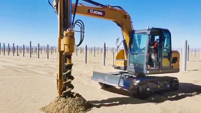 此次徐工挖掘機(jī)參建的巴彥淖爾100萬千瓦光儲+生態(tài)治理項(xiàng)目位于內(nèi)蒙古西部,是自治區(qū)年度重點(diǎn)工程,對當(dāng)?shù)刭Y源開發(fā)和綠色發(fā)展具有重要意義。 與以往常規(guī)項(xiàng)目不同,此次徐工挖掘機(jī)主要擔(dān)任光伏樁的鋪設(shè)工作,通過改裝振動錘和引孔機(jī)等多功能屬具,有效滿足現(xiàn)場多元化施工需求。