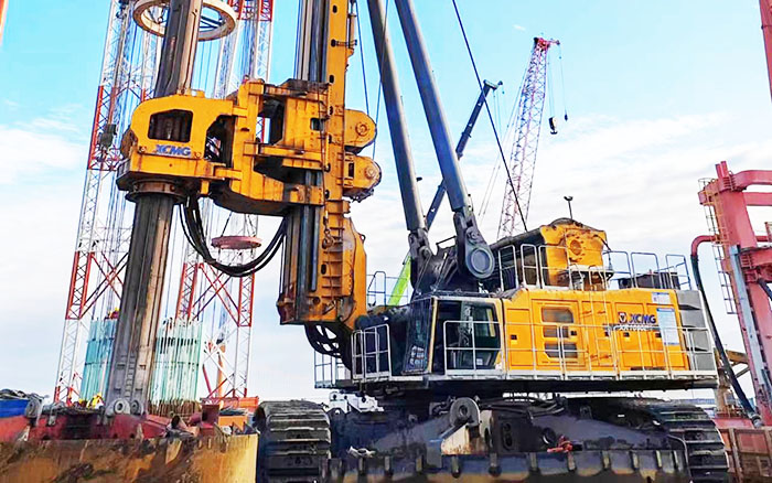 徐工XR1600E旋挖鉆機參建項目為世界上跨度最大的西堠門公鐵兩用跨海大橋,其中5號主塔墩基礎(chǔ)采用18根6.3m鉆孔灌注樁進行承載。XR1600E旋挖鉆機需要在大風(fēng)、激流、裸巖、深水的復(fù)雜海洋環(huán)境下為這座超級跨海大橋進行夯基,完成目前國內(nèi)最大直徑6.3m的鉆孔施工!