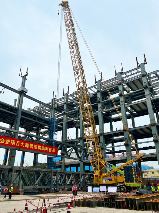 這里是西部(重慶)科學(xué)城鋼結(jié)構(gòu)科學(xué)會堂工程現(xiàn)場,近日,該工程迎來了重要節(jié)點,在數(shù)雙目光的注視下,兩臺黃色身影仿佛“心有靈犀”,經(jīng)過緊密配合,西南地區(qū)首例72米大跨度鋼桁架緩緩吊裝就位……