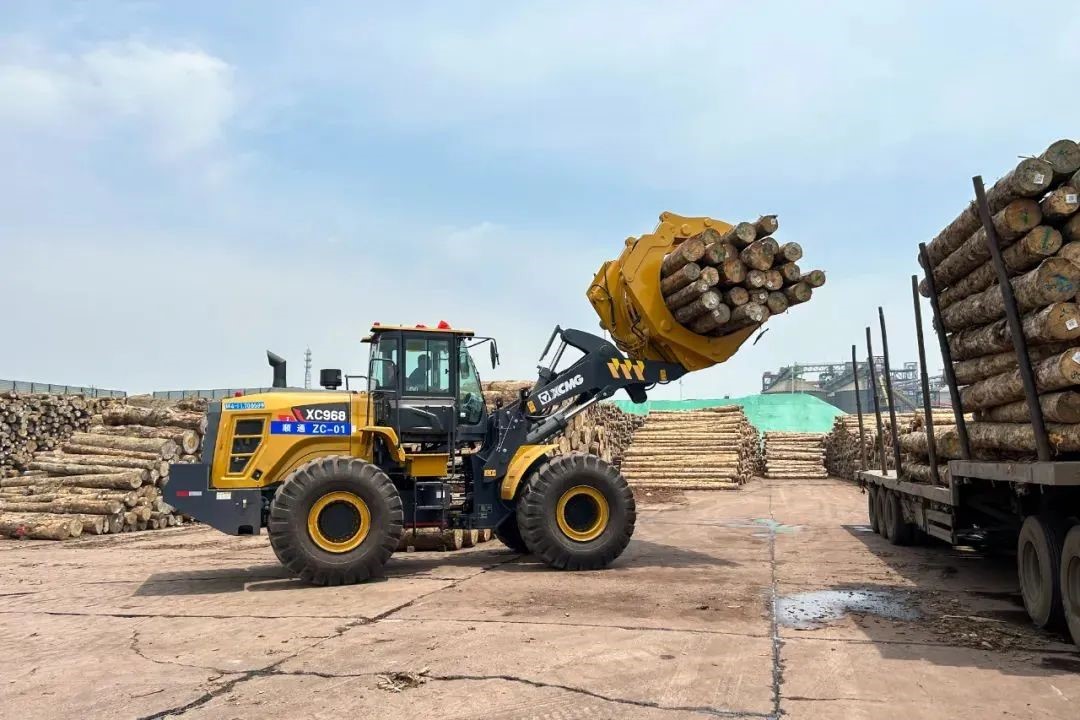 隨著滿載原木的貨輪緩緩靠岸,日照港瞬間切換為一派繁忙景象,20臺徐工XC968I夾鉗機(jī)迅速啟動(dòng)、排列有序登上甲板,將原木從入港船舶上夾起、轉(zhuǎn)運(yùn)至等待裝運(yùn)的卡車,動(dòng)作一氣呵成。