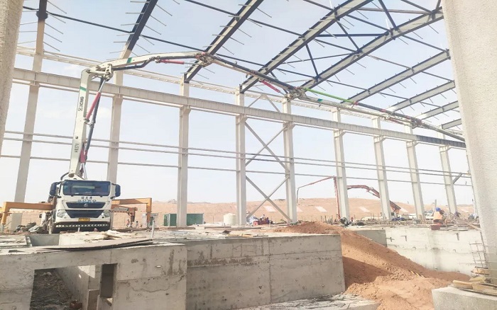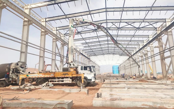 項(xiàng)目中后期以地面作業(yè)為主,鋼結(jié)構(gòu)廠房受限于空間操作,對(duì)設(shè)備的動(dòng)力和靈活提出了較高要求。最小起臂高度僅7.8米的徐工HB37V,靈活的通過(guò)性和操控性讓施工作業(yè)提質(zhì)增速,為項(xiàng)目施工破解難題。