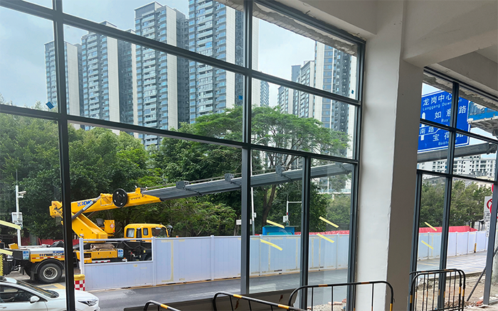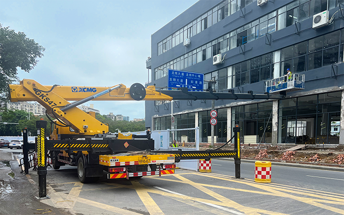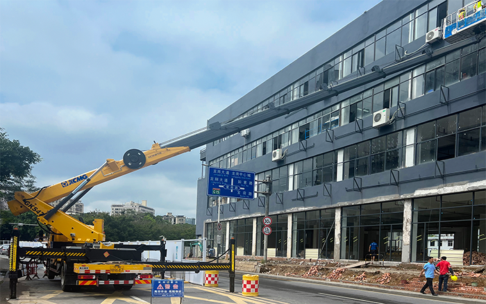 本次施工恰逢傍晚高峰期,時間緊、任務重,且水電路管道安裝需要長時間、高精準的持續(xù)性作業(yè),對高空車性能要求較高。為避免占道施工阻礙交通,徐工GKS47高空作業(yè)車在街道對面的臨時停車區(qū)域快速展車,作業(yè)斗搭載3名施工人員和管路材料平穩(wěn)伸出20余米,橫跨整條街道,直抵商鋪外立面的作業(yè)地點,憑借獨有的高精度比例閥驅(qū)動控制技術,實現(xiàn)微小流量的精準控制,使工作平臺毫米級的位置調(diào)節(jié),便于工作平臺位置精調(diào);柔性制動讓操作更加舒適,能夠精準識別操作員的操作意圖,制動體驗平穩(wěn)、低沖擊、小晃動,以“微動性、安全性、高效率、大跨距”產(chǎn)品特點完美應對此次施工任務。
