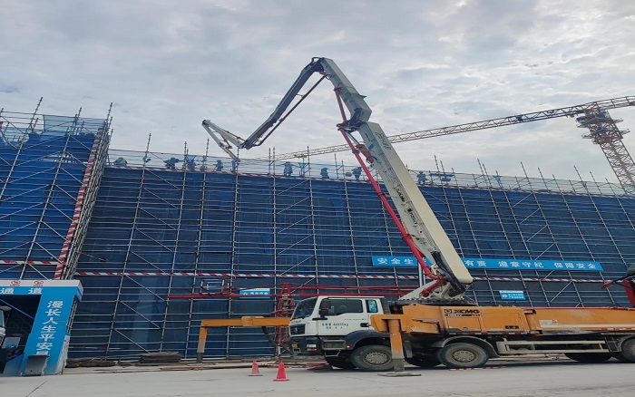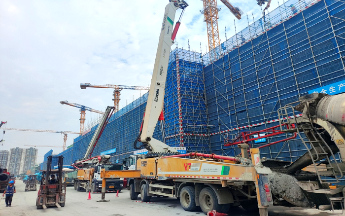 施工現(xiàn)場,臂架林立、機(jī)器運(yùn)轉(zhuǎn),徐工成套混凝土機(jī)械聯(lián)袂出擊,新能源攪拌車、車載泵、泵車齊上陣,從混凝土運(yùn)輸、泵送施工、服務(wù)保障等方面守護(hù)項(xiàng)目順利進(jìn)行。