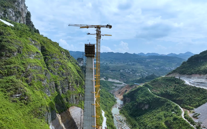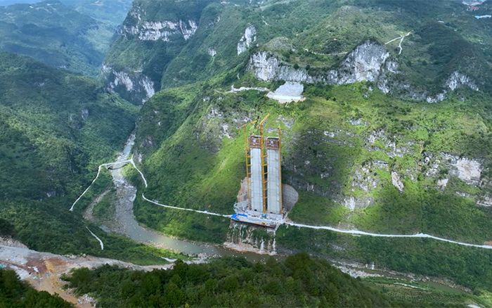 金旗特大橋是世界上目前在建最高的深山峽谷連體斜拉橋,主塔總高度達300.5米,施工區(qū)域多喀斯特地貌,地下巖層脆弱、兩岸山體陡峭、施工區(qū)域狹窄、轉運困難,其長度、塔柱高度、施工區(qū)域地形地貌均為國內罕見的高難度。