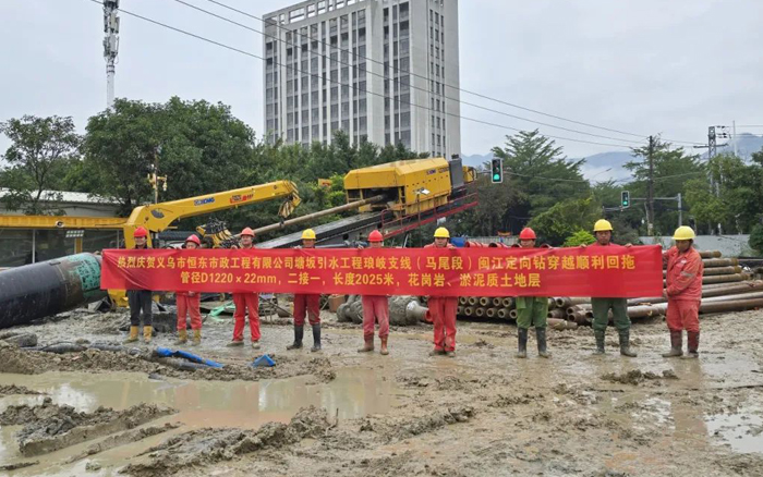 本次工程需穿越閩江,穿越距離長,地層條件復(fù)雜,淤泥與花崗巖交錯,施工難度系數(shù)大,此前,該項穿越工程因設(shè)備能力等原因停滯長達4年之久。施工過程中,徐工XZE8200起步回拖最大推拉力達到370t,最大扭矩90kN·m,全程高效施工,順利完成回拖,贏得了客戶和工程項目部的高度認可。
