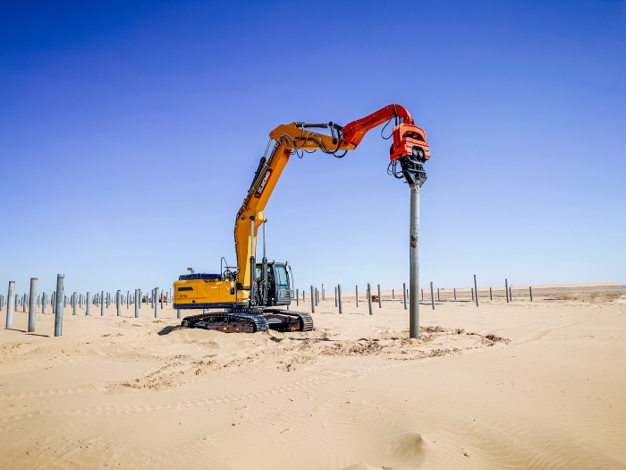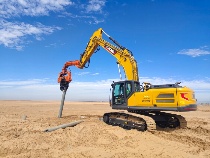 與以往常規(guī)項(xiàng)目不同,此次徐工挖掘機(jī)主要擔(dān)任光伏樁的鋪設(shè)工作,通過改裝振動(dòng)錘和引孔機(jī)等多功能屬具,有效滿足現(xiàn)場多元化施工需求。