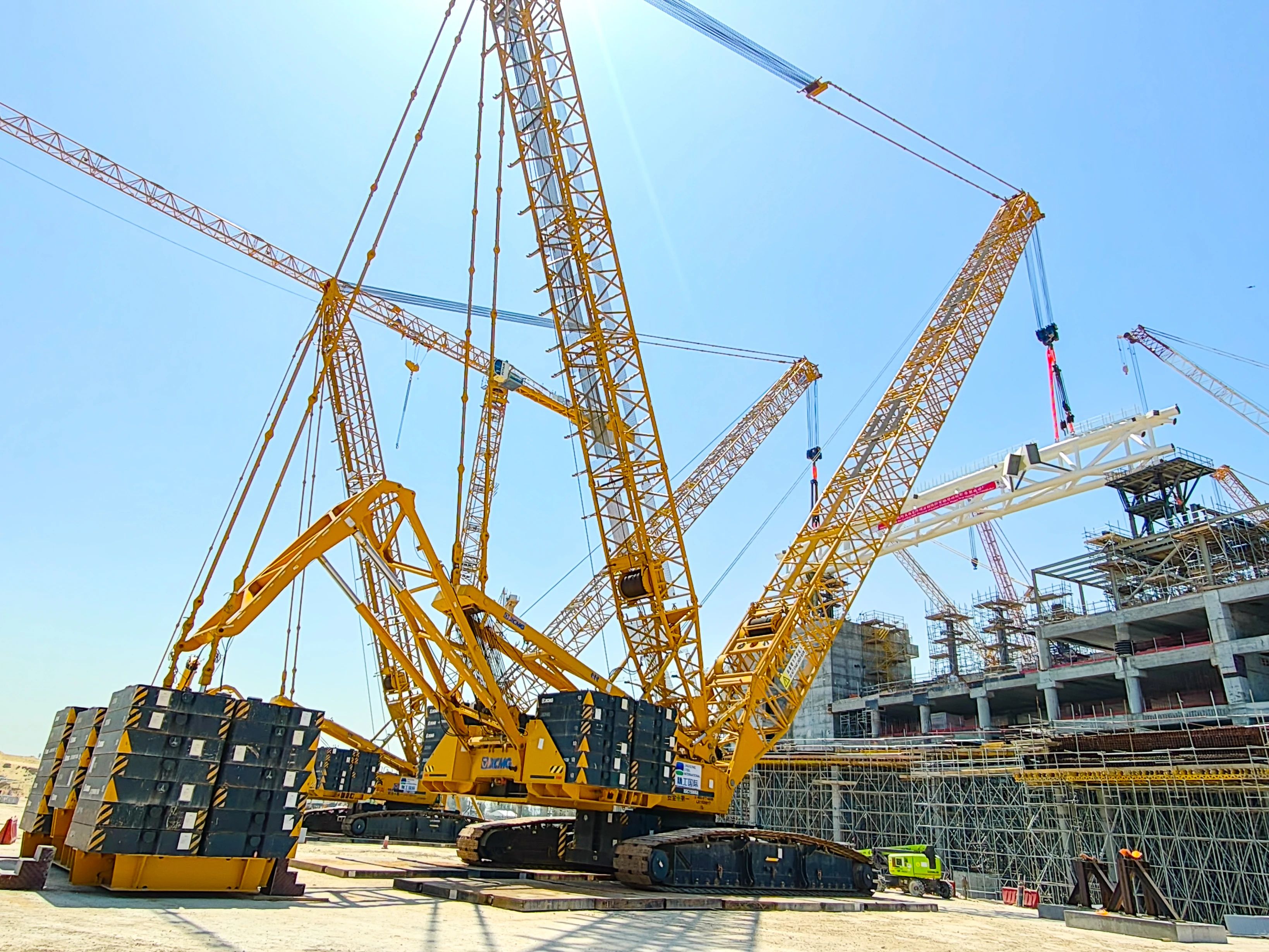 徐工兩款大噸位履帶式起重機(jī)——XGC15000A(1000噸級(jí))與XGC12000(800噸級(jí))強(qiáng)勢(shì)出擊。施工現(xiàn)場(chǎng),XGC15000A以85米超起重型主臂應(yīng)對(duì)超高作業(yè)需求,吊裝過程平穩(wěn)高效;XGC12000則采用84米超起重型主臂形成科學(xué)夾角,大幅提升拆裝效率。