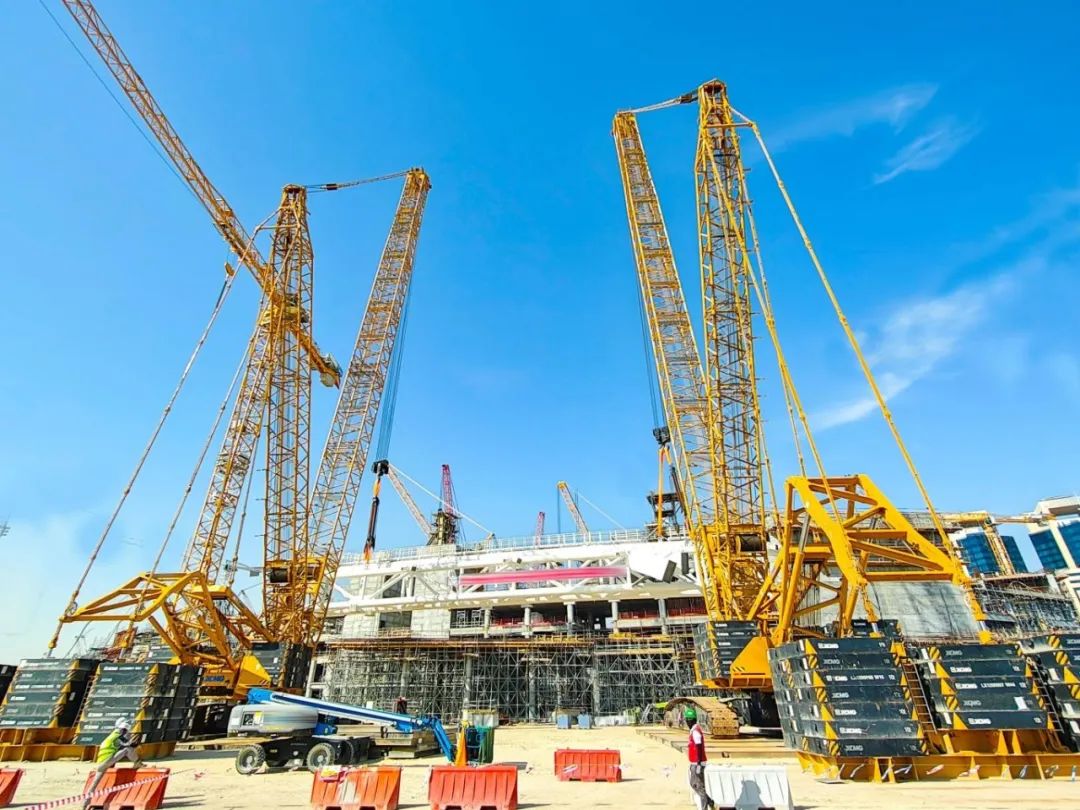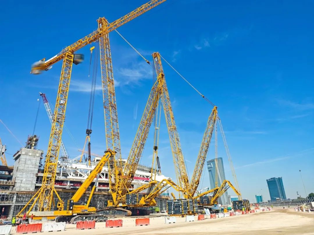 萬里之外的中東沙漠,2034年世界杯主場館建設(shè)現(xiàn)場,XGC15000A與XGC12000領(lǐng)銜組成"鋼鐵艦隊"。