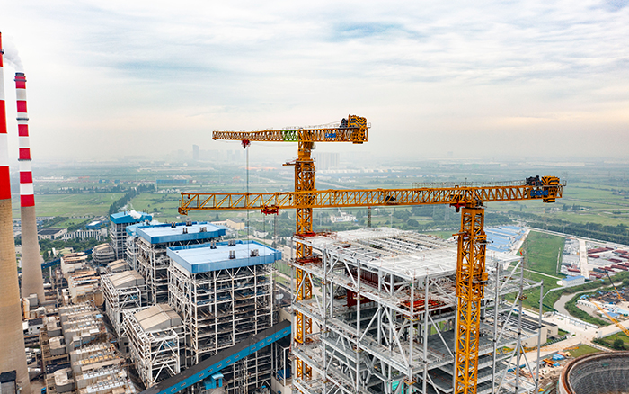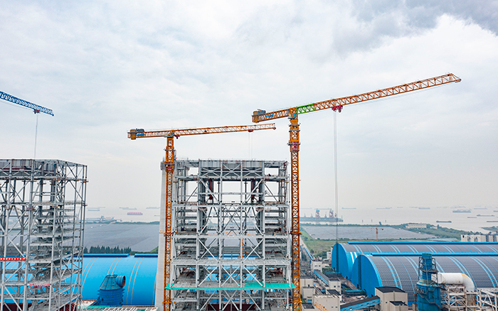 側(cè)望長江畔,機器轟鳴、江水潺潺,華能太倉電廠機組擴建項目施工現(xiàn)場一派繁忙景象,XGT3100-160S、XGT1350-64S兩臺徐工超大塔穩(wěn)穩(wěn)矗立在高聳的鋼架間吊裝作業(yè)。