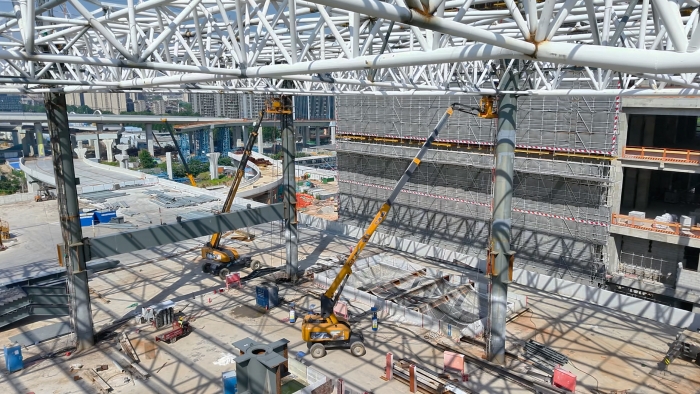 以徐工XGS40K為代表的十余臺徐工高機有的“一枝獨秀”,平穩(wěn)變幅直指站房屋頂;有的精準(zhǔn)定位,靈活探入桁架之間緊貼焊接點,成為保障鋼桁架高空焊接作業(yè)的主力軍,熱火朝天的為祖國交通樞紐建設(shè)貢獻力量。