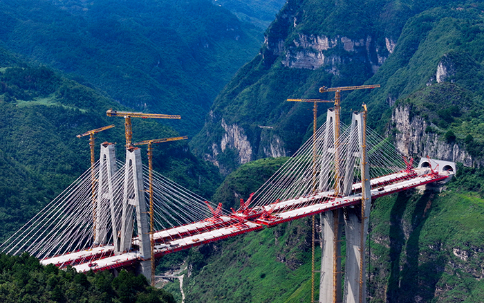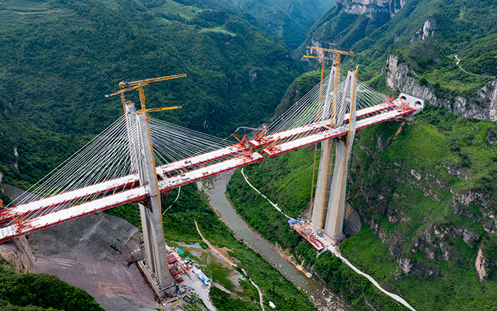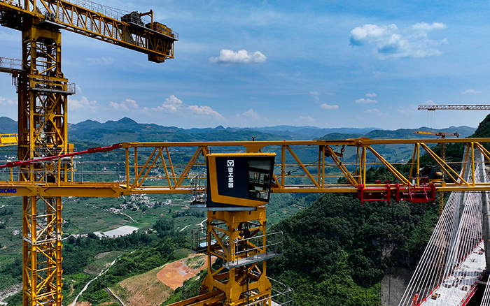 在黔中腹地懸崖峭壁間的烏長(zhǎng)高速公路金旗特大橋項(xiàng)目上,徐工群塔與施工升降機(jī)協(xié)同作業(yè),助力世界最高深山峽谷連體斜拉橋建設(shè)。
