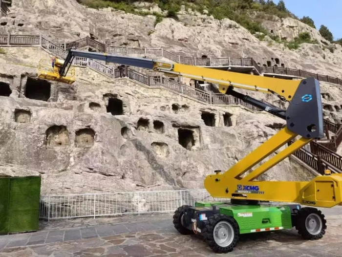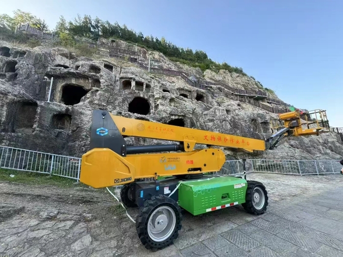 時間回溯到2021年,由于遭受多場暴雨侵襲,龍門石窟部分洞窟內(nèi)滲漏水嚴重甚至出現(xiàn)積水,部分山體表面巖石脫落、松動,嚴重威脅文物安全,急需得到有效治理。龍門石窟研究院隨即開展了為期1年多的“龍門石窟蓮花洞至石牛溪區(qū)域保養(yǎng)維護項目”。徐工XGS25ACK-Li直臂式高空作業(yè)平臺作為“得力助手”,深度參與各項保護修復工作。
