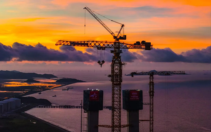 在封頂作業(yè)中,徐工塔機(jī)將百噸構(gòu)件以毫米級(jí)精度吊裝至200余米高空,硬剛10級(jí)海風(fēng),創(chuàng)造了海上橋梁建設(shè)新紀(jì)錄。多臺(tái)群塔協(xié)同作業(yè),創(chuàng)造性攻克"高空精度、抗風(fēng)穩(wěn)性、吊裝效率"三大世界級(jí)施工難題,展現(xiàn)了中國(guó)裝備的卓越性能。