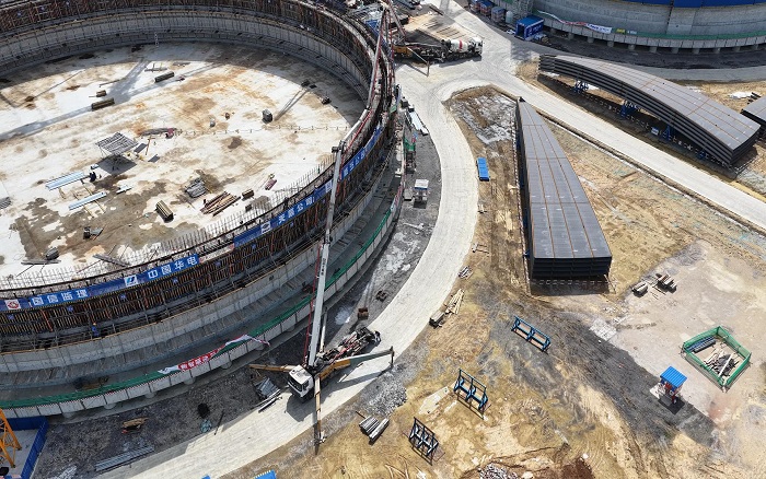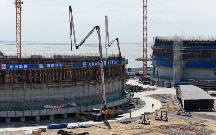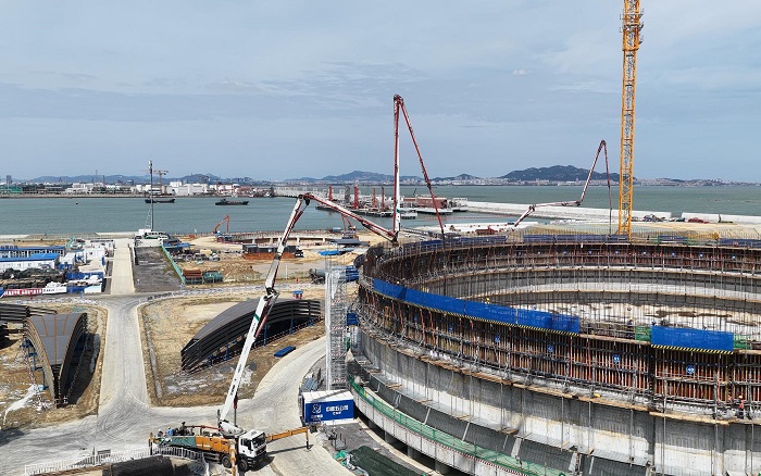 隨著各環(huán)節(jié)建設有序推進,3座22萬立方米的LNG(液化天然氣)儲罐正式進入罐體墻體澆筑。每座儲罐高達50多米,相當于18層樓高度,海風裹挾的高濕度環(huán)境,給高空作業(yè)難度層層加碼!
