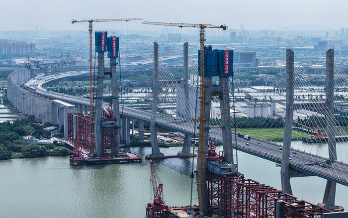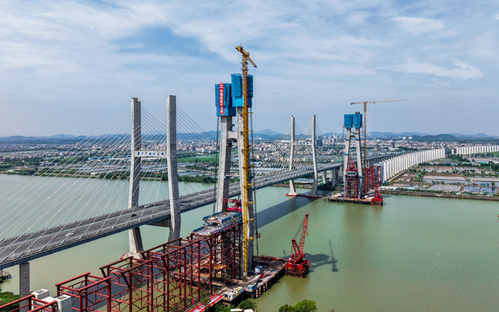 在深江鐵路重難點(diǎn)工程——跨磨刀門水道主橋施工現(xiàn)場(chǎng),兩臺(tái)徐工XGT7527A-18S正穩(wěn)定吊裝,橫梁與對(duì)應(yīng)部位的塔柱同步施工,后續(xù)4臺(tái)施工升降機(jī)也將陸續(xù)入駐項(xiàng)目,共同助力主橋中、上塔柱爬升施工。