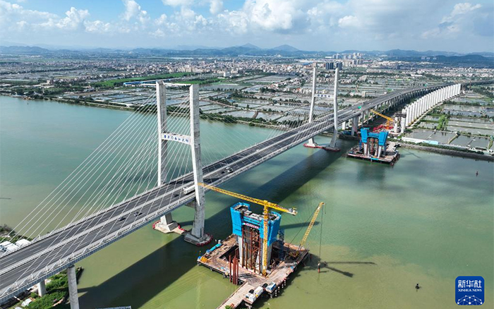 目前,深江鐵路跨磨刀門水道主橋東主塔已封頂。