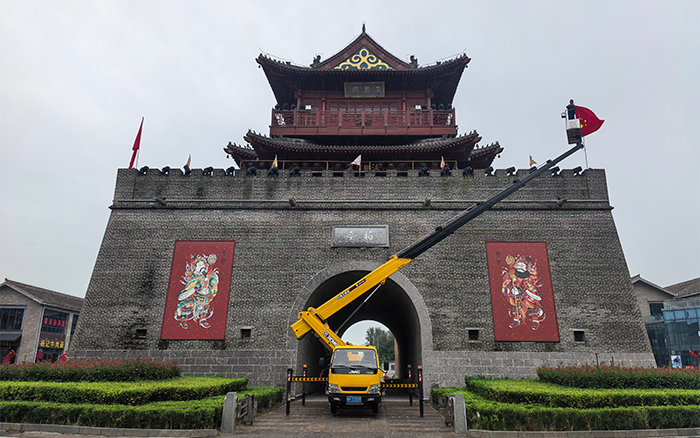 狹窄場地里,設(shè)備優(yōu)勢更顯突出。大跨距支腿快速撐開,軟腿檢測系統(tǒng)實時發(fā)出安全預(yù)警,上下車互鎖裝置筑牢多重安全防線。無線遙控器支持操作員地面把控全局,毫米級微調(diào)確保每面國旗懸掛角度絲毫不差。