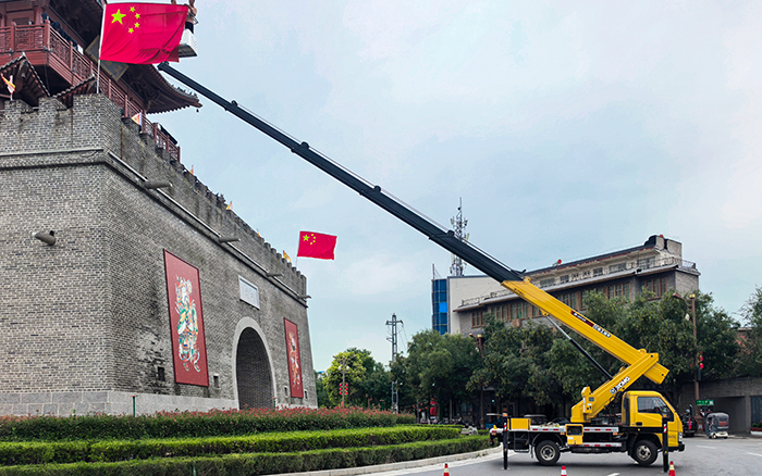 文昌閣前,一抹抹 “中國紅” 悄然升起。徐工 M 系列 GKS32 高空作業(yè)車伸展長臂,穩(wěn)穩(wěn)將施工人員送達高空作業(yè)點。最大作業(yè)高度32 米,精準(zhǔn)覆蓋建筑立面,轉(zhuǎn)臺 360° 連續(xù)回轉(zhuǎn)間,國旗已平穩(wěn)就位。
