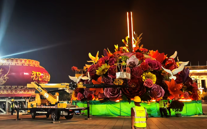 天安門廣場上的“祝福祖國”花籃如期亮相
