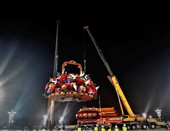 這已是徐工連續(xù)第十五年參與天安門國慶花籃吊裝任務(wù)。9月22日凌晨,兩臺徐工200噸級汽車起重機協(xié)同作業(yè),將重達60噸的籃盤平穩(wěn)起吊,與16米高的籃體實現(xiàn)毫米級精準對接。