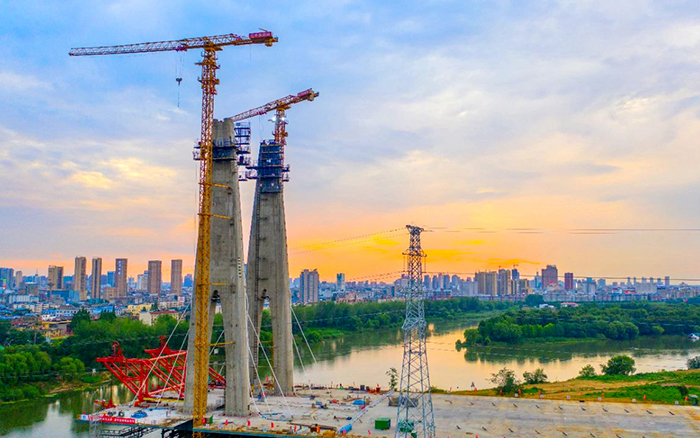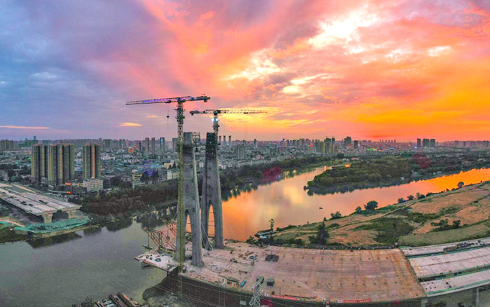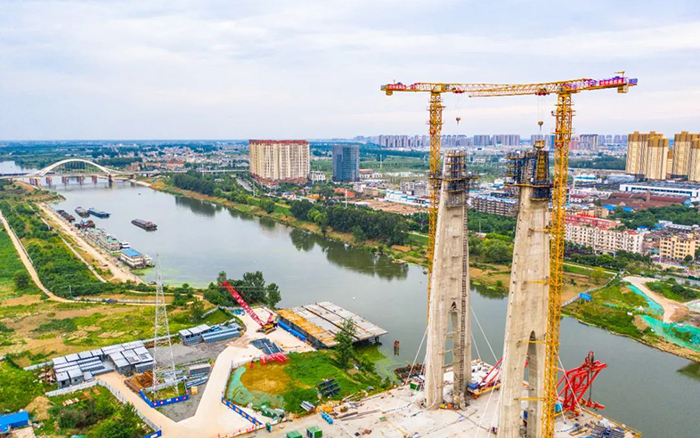 此次參建的項(xiàng)目是阜裕大橋項(xiàng)目,主要承接橋梁主塔的吊裝任務(wù)。阜裕大橋全長(zhǎng)1735米,橋梁長(zhǎng)1127米,主橋采用獨(dú)塔斜拉橋結(jié)構(gòu),主塔高95.6米,主橋斷面為60米超寬幅鋼箱梁,是國(guó)內(nèi)市政最寬鋼箱梁橋,建成后將成為阜陽的又一個(gè)“新地標(biāo)”。