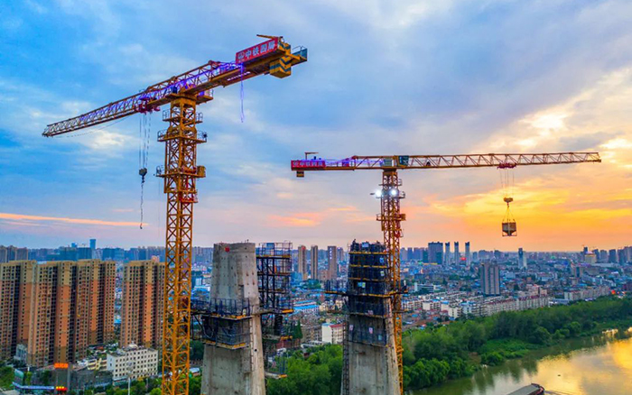 近日,數(shù)臺(tái)徐工XGT7527A-18S塔機(jī)聳立潁河之畔,百米身姿、直插云端,晚霞映襯下的“徐工金”更加耀眼。